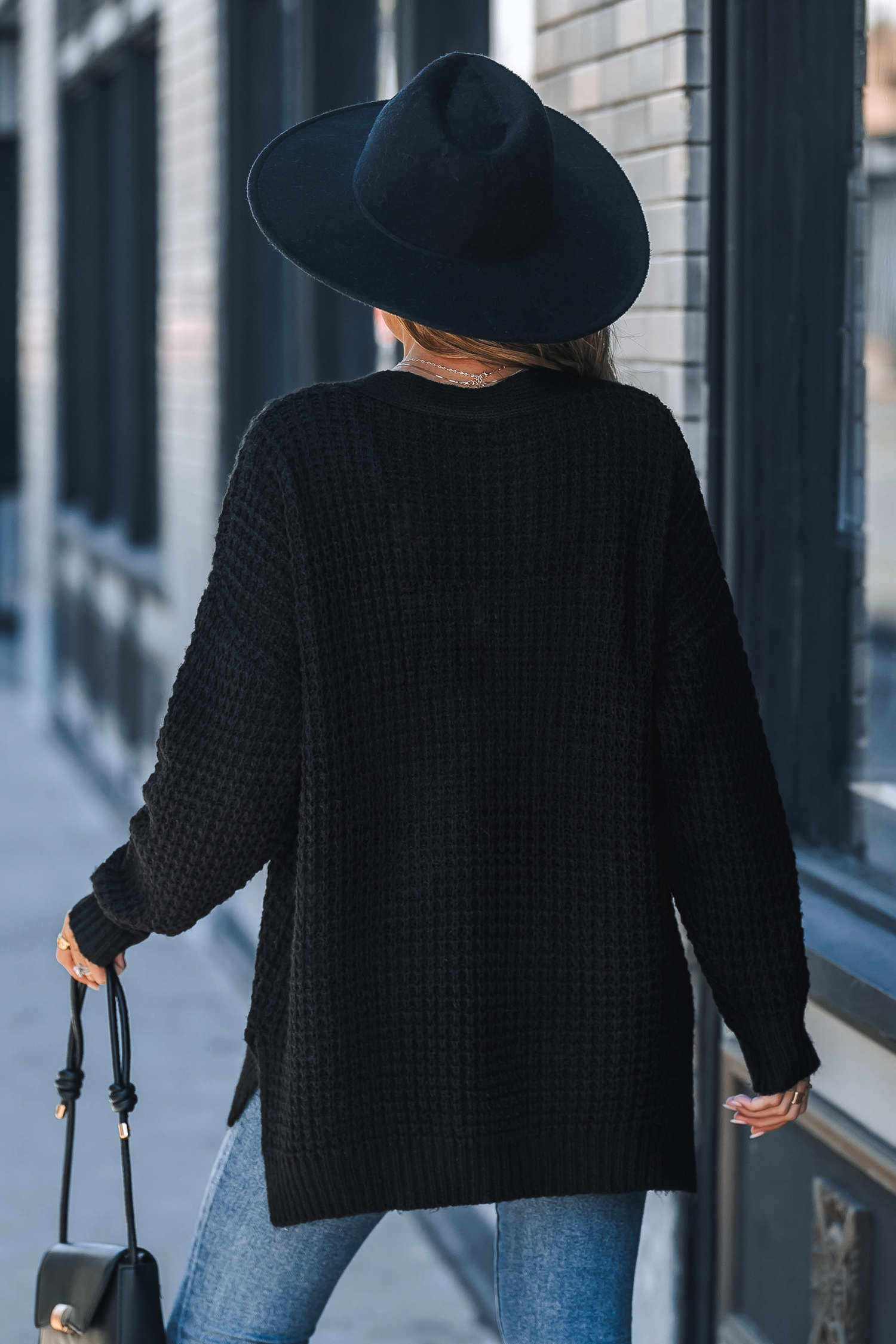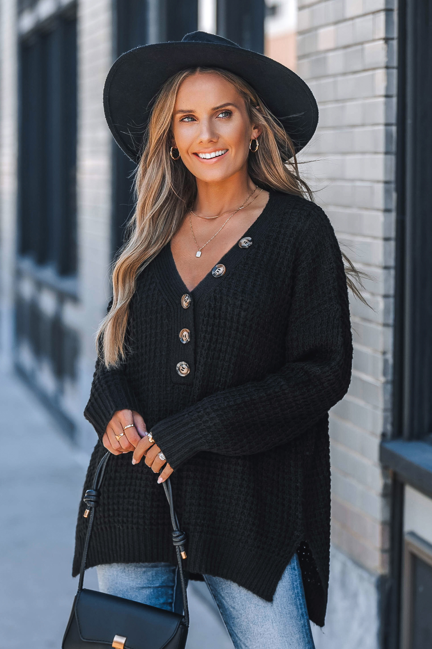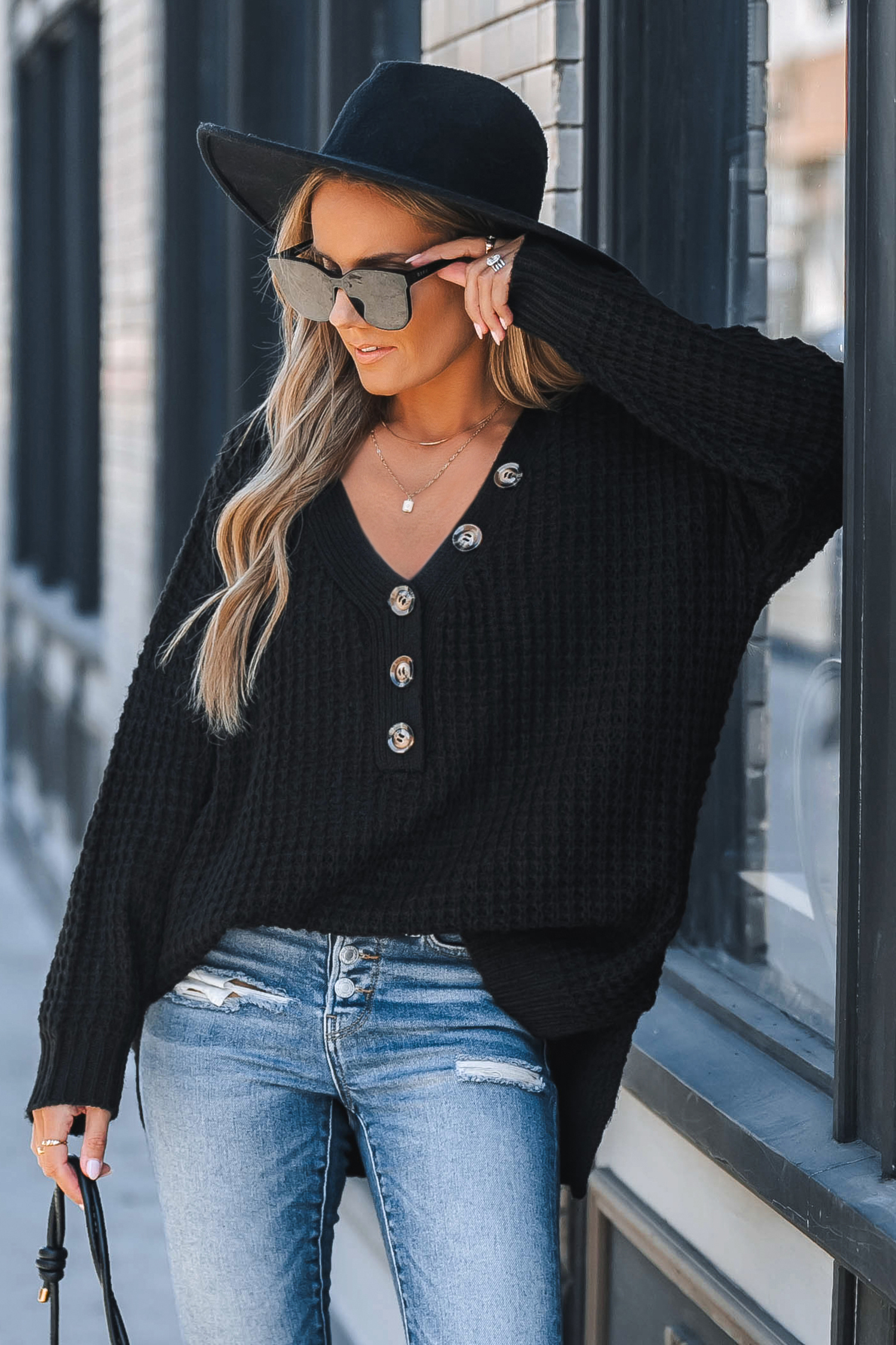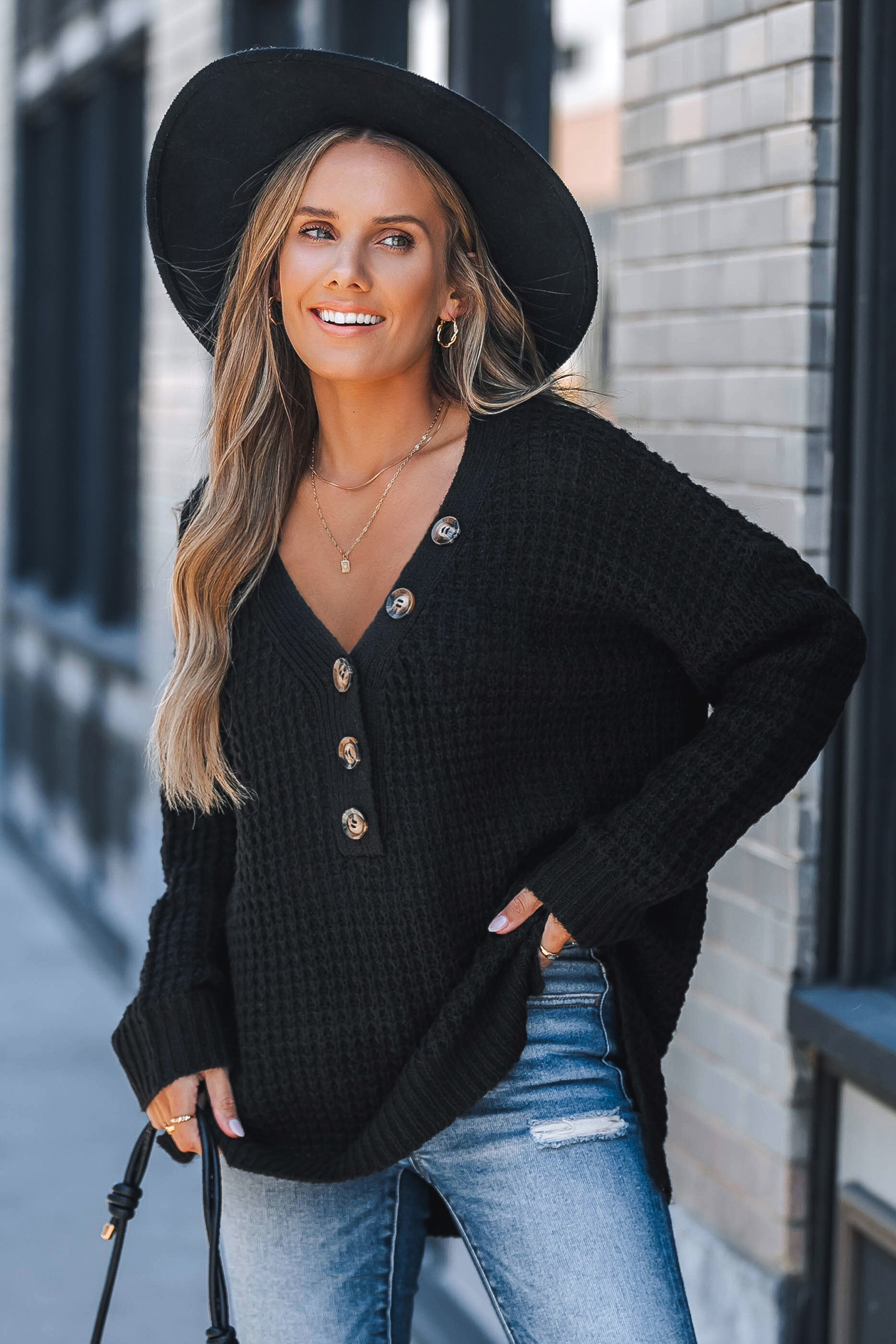 Czarny sweter typu henley z długim rękawem i dekoltem w serek