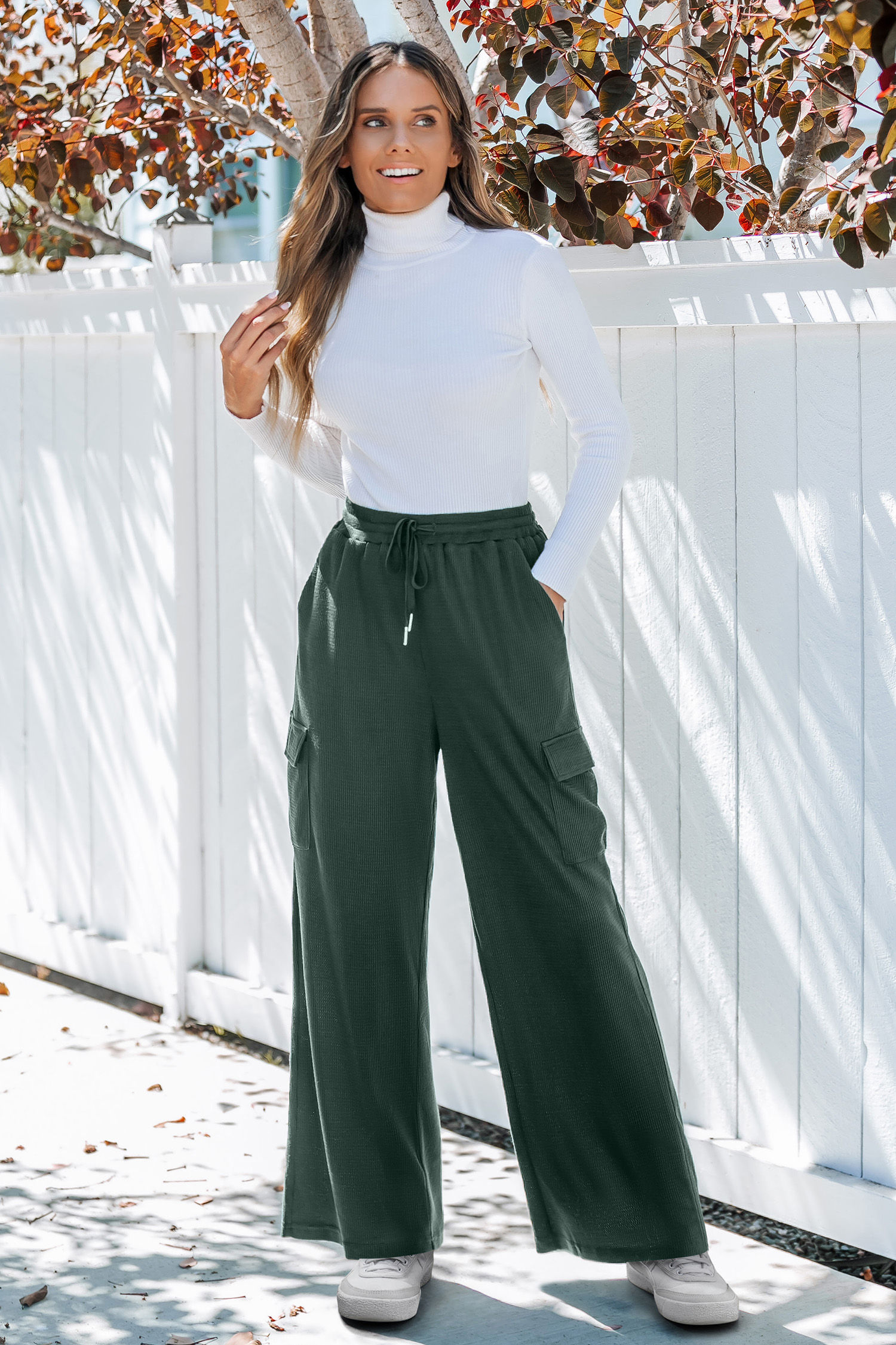 Strona głównaZielone spodnie robocze ze ściągaczem w pasie i szerokimi nogawkami